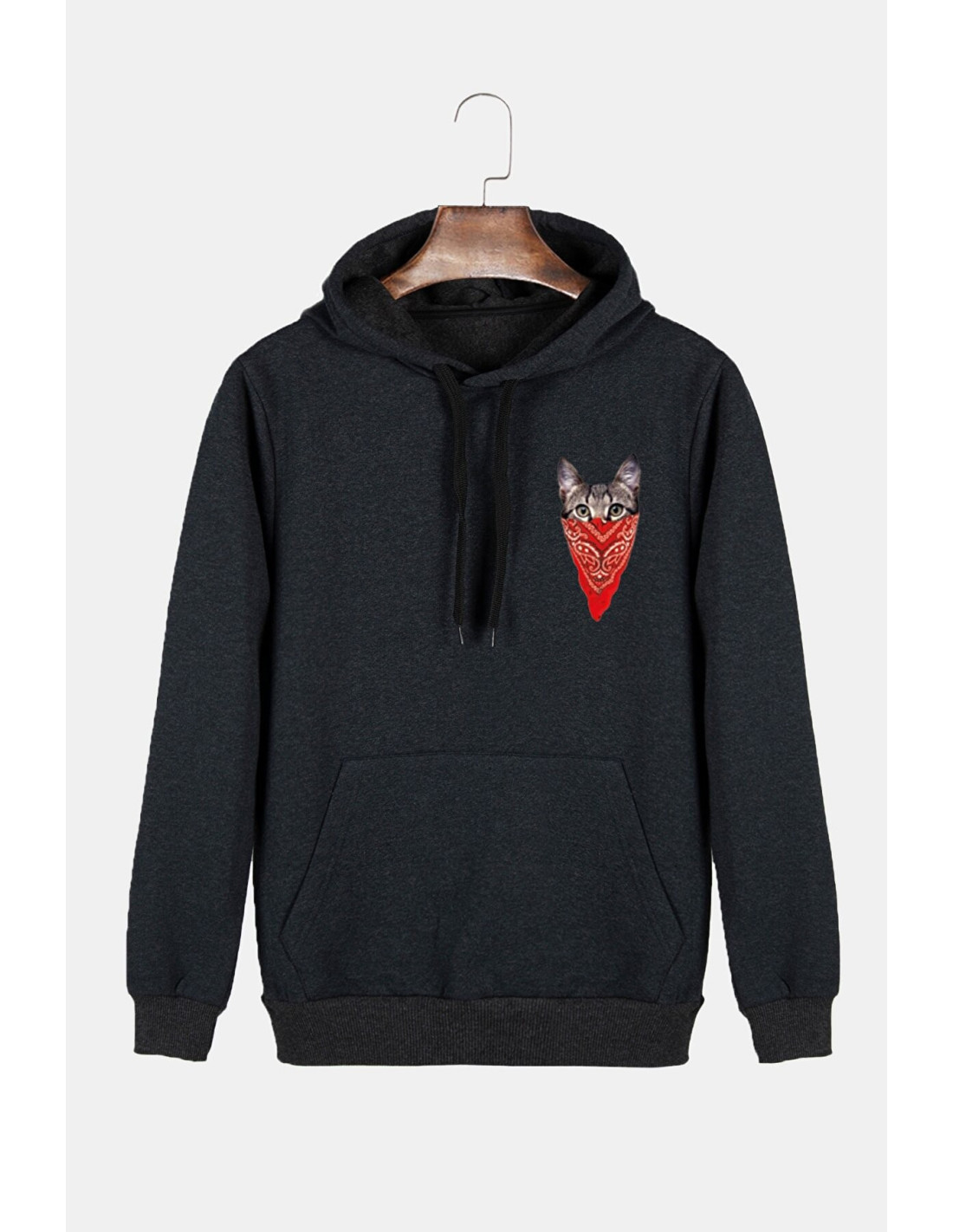 Unisex Antrasit Kapüşonlu Maskeli Kedi Baskılı Slim Fit Kanguru Cepli Sweatshirt